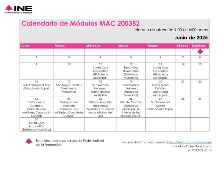 El Instituto Nacional Electoral (INE) informa que el módulo MAC 200352 estará disponible en nuestra localidad el día 17 de junio de 2025 en la Presidencia Municipal.