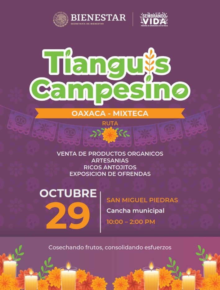 TIANGUIS CAMPESINOpor adminen Publicado el noviembre 11, 2023noviembre 11, 2023 Te invitamos al tianguis campesino este 29 de octubre en la cancha municipal desde las 10:00 A.M. hasta las 02:00 P.M.